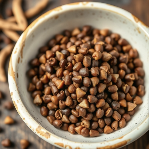 Mustard seeds are small, pungent seeds that add heat and flavor to curries, pickles, and salads.